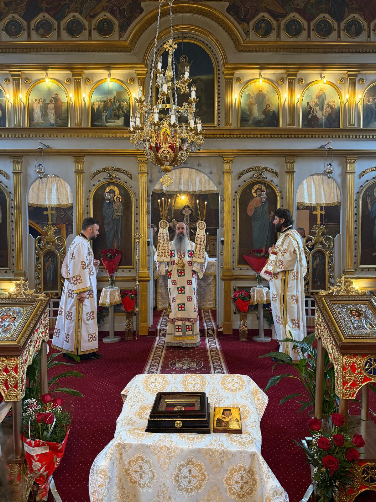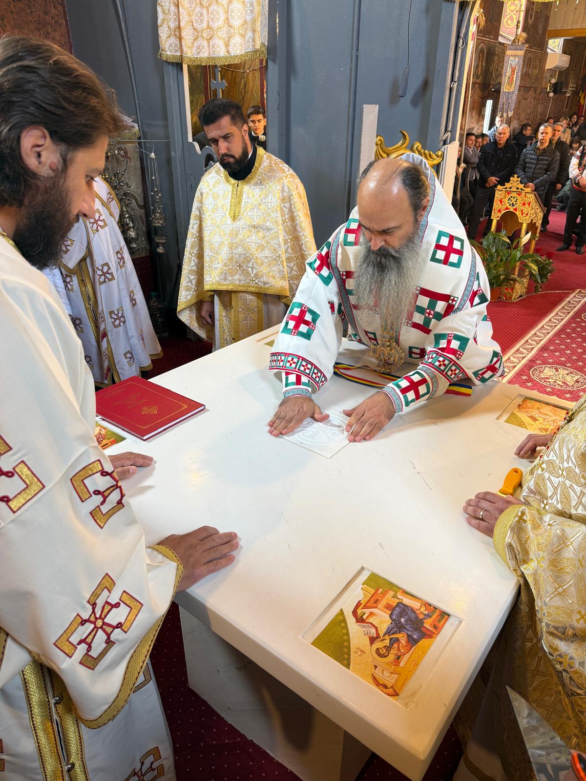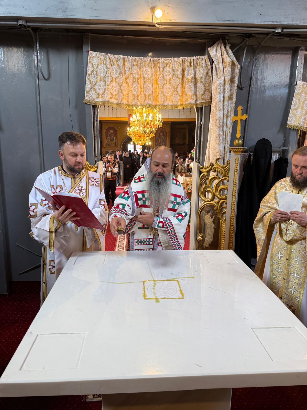 La vremea potrivită, Preasfinția Sa a binecuvântat lucrările executate la exteriorul lăcașului de cult, apoi a târnosit Sfânta Masă a altarului, așezând în piciorul ei moaștele Sfinților Mucenici Epictet și Astion, cei mai vechi martiri de pe teritoriul țării noastre, conform izvoarelor aghiografice.