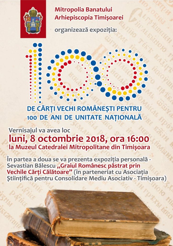 Luni 8 octombrie 2018 de la ora 16,00 la Muzeul Catedralei Mitropolitane din Timişoara va avea loc expoziţia de carte veche românească organizată de Arhiepiscopia Timişoarei, cu tema: ,,100 de cărţi vechi româneşti pentru 100 de ani de unitate naţională”. Se vor putea vedea: Noul Testament de la Bălgrad, 1648 ( prima traducere în limba română, după izvoare greceşti şi slavone), Biblia de la Bucureşti, 1688(prima traducere şi imprimare integrală a Bibliei în limba română), Cazania lui Varlaam sau Carte românească de învăţătură, 1643 (una din cele mai însemnate cărţi din istoria culturii româneşti), Pravila de la Govora, 1640, ( primul cod de legi bisericeşti şi civile din Ţara Românească în limba română) şi multe altele.